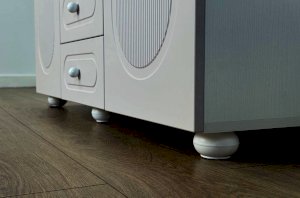 Корпус шкафа выполнен из ЛДСП толщиной 16 мм, фасады изготовлены из МДФ в плёнке ПВХ и декорированы фрезеровкой. Оригинальные круглые ручки и опоры подчёркивают стиль мебели и придают ей визуальную лёгкость.